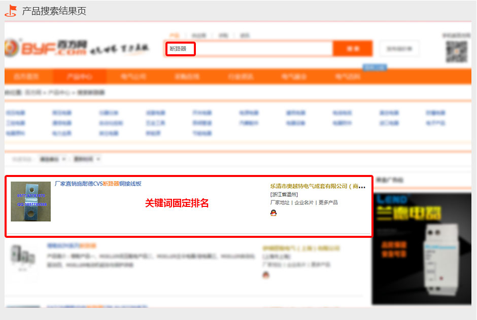 “關(guān)鍵詞固定排名”是搜索排名服務(wù),是百方網(wǎng)給會(huì)員提供黃金推廣位置的一個(gè)展示服務(wù),搶先被買家看到。購(gòu)買此服務(wù)的用戶,可在購(gòu)買關(guān)鍵詞的產(chǎn)品搜索結(jié)果頁左側(cè)獲得本企業(yè)的形象展示。該服務(wù)針對(duì)相性強(qiáng)、目標(biāo)明確。以最直觀的形式獲得關(guān)注,領(lǐng)先競(jìng)爭(zhēng)對(duì)手凸顯企業(yè)實(shí)力。